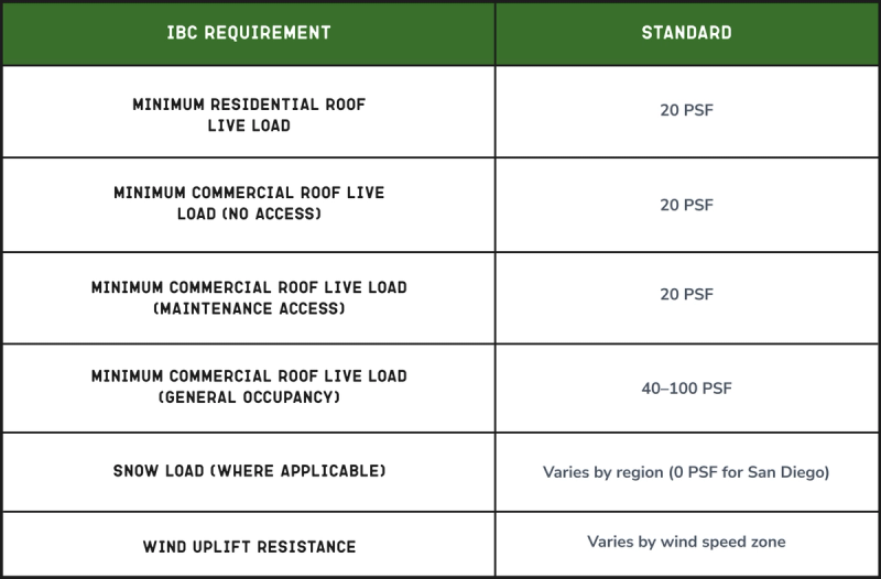 Key Takeaway: IBC requires a minimum 20 PSF live load capacity for residential roofs and 20 to 100 PSF for commercial roofs depending on access classification — San Diego's zero snow load requirement provides additional capacity for equipment installations.