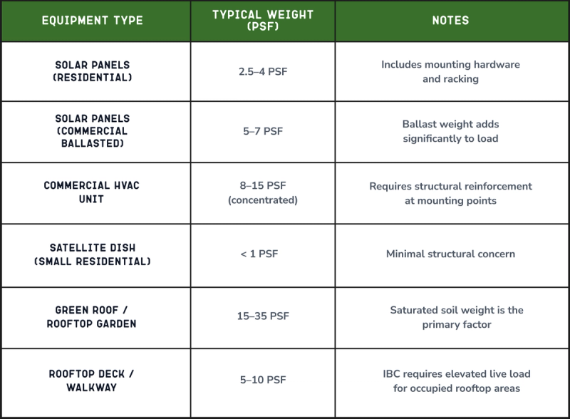 Key Takeaway: Solar panels add 2.5 to 4 PSF for residential systems and 5 to 7 PSF for commercial ballasted systems, while HVAC rooftop units create concentrated loads of 3 to 15 PSF that require structural evaluation at their specific mounting points.